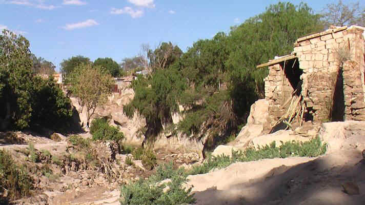 Dieser harmlos aussehende Fluß hat hier vor kurzem erheblichen Schaden angerichtet. Bis auf halbe Fensterhöhe stiegen die Fluten.