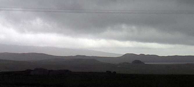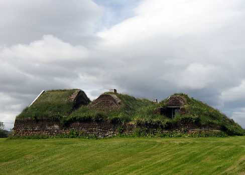 Ausblick von der Kirche und unweit Torfrasenhäuser von 1854, die bis etwa 1950 noch bewohnt waren.