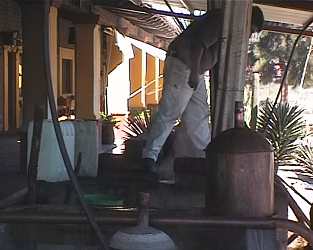 Streng bewacht wird der Eingang zum Laden mit dem fertigen Mezcal, der hier in der Nähe von Oaxaca hergestellt wird. Definition: Tequila und Mezcal sind beides