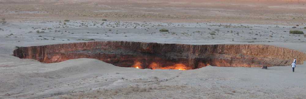 Mitten in einer weiten flachen Landschaft befindet sich der Feuerkrater, der bei Erdgasbohrungen entstanden ist.