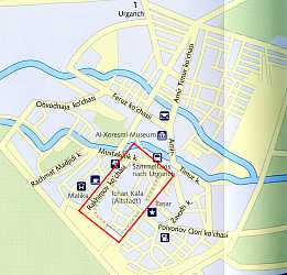 Chiwa hat 60.000 Einwohner, von denen nur wenige entlang der Mauern in der Altstadt leben. Die äussere Stadt haben wir nicht besichtigt. Der Plan zeigt, was es in