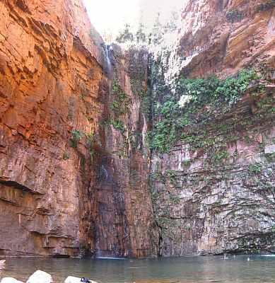 Als Belohnung ein erfrischendes Bad. Der Wasserfall recht spärlich. Interessant, das von den Wänden tropfende Wasser.